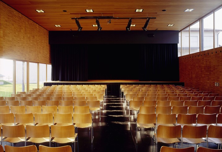 Östlich des bestehenden Gemeindehauses befand sich zu Beginn der Planungsarbeiten ein bewohntes, kleines Einfamilienhaus, das vorläufig nicht zur Disposition stand. Aus diesem Grund wurde der neue Baukörper des Dorfsaales südlich des Hauses – sozusagen in zweiter Reihe – angeordnet. Um dem davor entstehenden Dorfplatz die nötige bauliche Fassung zu verleihen, wurde ein ausladender„Finger“ (Bücherei, Bar) orthogonal an den Saal angefügt. Das raue Äußere (dunkel eingefärbter Splitbeton) des Neubaus ist hart und kantig wie ein Fels. Im Inneren ist der Baukörper komplett in Eiche ausgebaut. Bei abendlichen Veranstaltungen strahlt das vom Holz reflektierte Licht - schon von Weitem sichtbar - warm und einladend nach außen. Um die sichtbare Kubatur gering zu halten, wurden sämtliche Nebenräume und deren Erschließung unter die Oberfläche des Platzes gelegt. Die Volumetrie des Körpers ist von außen nicht erfassbar. Die Blick- und Lichtführung entspricht dem Verlauf des Hanges und die Maßstäblichkeit des Ortes bleibt gewahrt. Das aus den 60er Jahren stammende alte Dorfhaus wurde im Inneren neu strukturiert und saniert sowie intern mit dem Neubau verbunden. Nach dem Tod der Besitzerin, wurde das (glücklicherweise) entwurfsbestimmende Haus abgetragen und der Dorfplatz fertig gestellt.