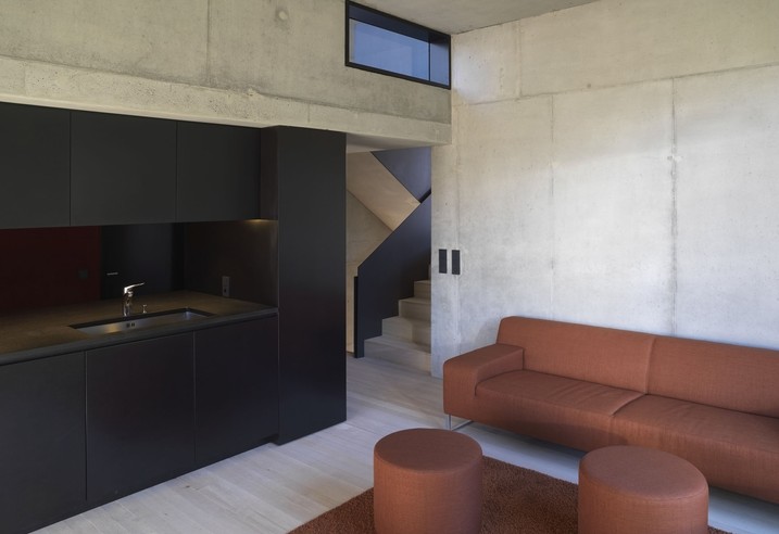 Diese wurden so über einem reduzierten Sockelgeschoss verdichtet, dass jeder Raum, mit seiner jeweiligen Funktion, einen logischen Dialog (Höhenlage, Himmelsrichtung, Ausblick, Lichteinfall etc.) mit dem Außenraum eingeht. Das "Baumhaus" bildet dabei den intimen oberen Abschluss der komplexen Raumfolge mit Blick in das Panorama der Schweizer Berge. Die Betonkonstruktion bleibt in den Innenräumen sichtbar und wird durch Einbauten mit weicher Oberfläche oder warmer Farben bereichert. Die verwendeten einfachen Materialien (MDF, Filz, Tannendielen) werden durch die Exaktheit ihrer Verarbeitung zu edel wirkenden Gegensätzen des schlichten Betons.